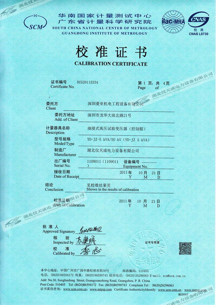 轉載:"YD-JZ-5kVA/50kV油浸式高壓試驗變壓器的資質證書" 請注明來源于儀天成電力。 更多技術問題請致電儀天成電力客戶服務:027-87876585,技術部專線:027-87876585,在線客服:719388481