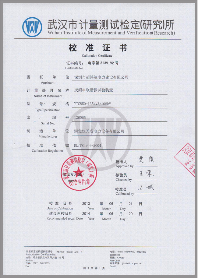 轉(zhuǎn)載:"YTC850系列電纜交流耐壓試驗裝置鑒定證書" 請注明來源于儀天成電力。  更多技術(shù)問題請致電儀天成電力客戶服務(wù):027-87876585,技術(shù)部專線:027-87876585,在線客服: